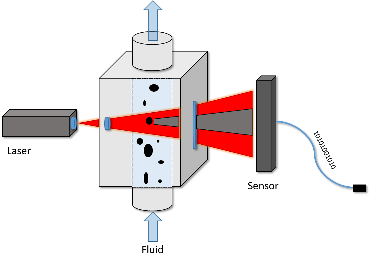 Der Partikelzähler arbeitet nach dem Extinktionsprinzip. Dabei wird die zu untersuchende Flüssigkeit an einem Laser vorbeigeleitet, der von einer Lichtquelle entsendet wird. Das erzeugte Licht kann nicht durch in der Lösung vorhandene Partikel oder Verunreinigungen hindurchtreten und wird absorbiert (siehe Abbildung unten). Eine Fotodiode misst das verbleibende Licht und ermöglicht durch die Analyse der Extinktion die Berechnung der Größe und Anzahl von vorhandenen Partikeln (Light Obscuration Particle Count). Eine schnelle und exakte Bestimmung von Partikelgröße und Gesamtpartikelgehalt pro Volumen ist so möglich.